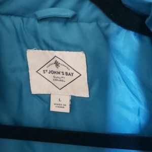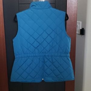 Blue teal quilted vest with gold zippered decal
