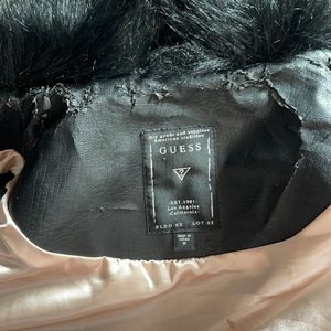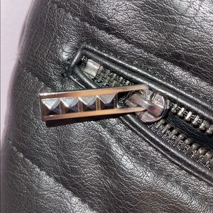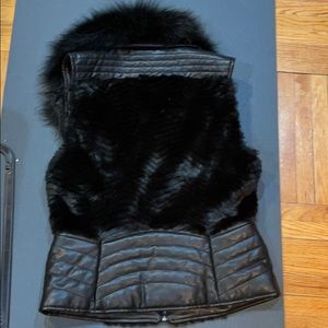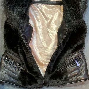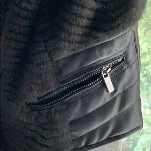 Faux fur vest with pleather size medium, two pockets with zippers, can be dressed up or down. Super cute. Unfortunately due to sitting in closet and with weather the inside of the top faux leather part has cracked. It is not visibility at all on outside. See pictures.