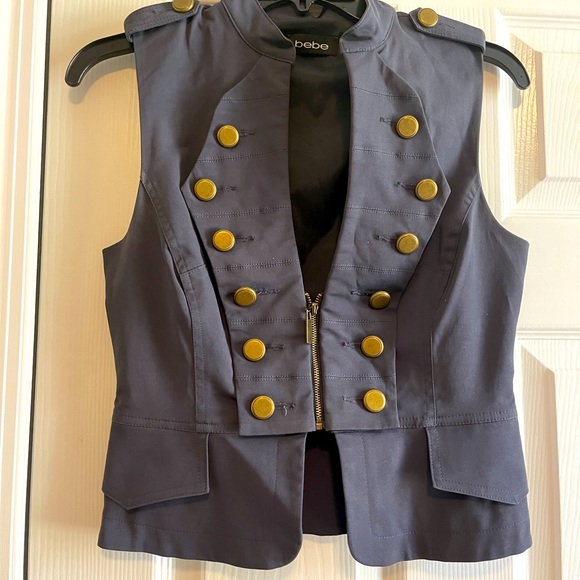 Military style vest with gold buttons and front zipper.
