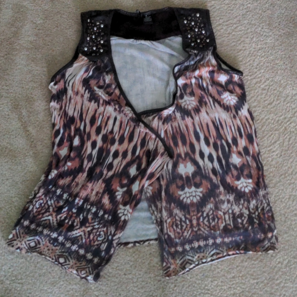 Brown, tan and cream vest. Body is 97% polyester, 3%spandex. Contrast and lining 100% polyester.