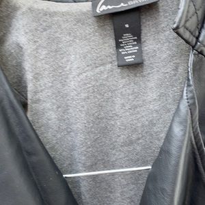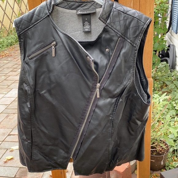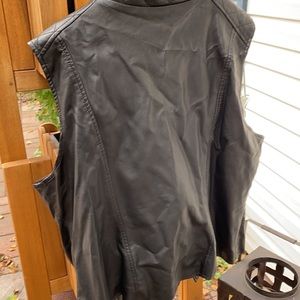 Lane Bryant vest - shell coating polyurethane backing. 100% viscose. Lining is 67% polyester 33% cotton. Machine wash cold with like colors. Only non chlorine bleach Line dry and no iron.