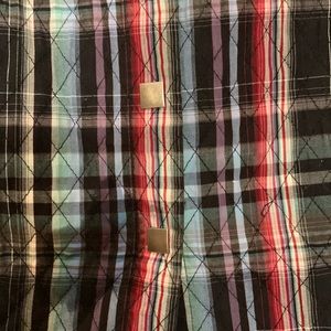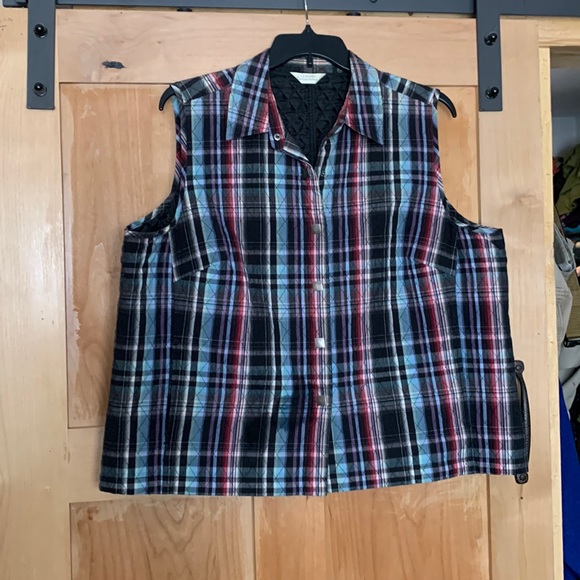 CJ Banks vest. Thin, Quilted cotton, multi colored, black, purple, cream, blue, red, teal. Side slit pockets, brushed nickel hardware. Back had two slits in back for extra room if needed.
