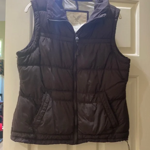 Great chocolate brown puffer vest from American Eagle. I love chocolate brown but it is so hard to find. Great for any cool day. Fiberfill vest. Lining super soft grey and white stripes. Enjoy.