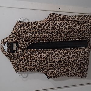sleeve less vest with pockets. zipper. black interior outside cheetah print. size S but runs larger