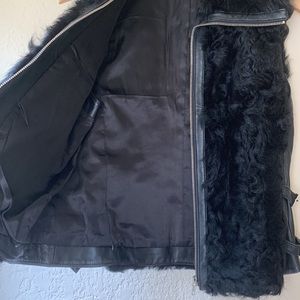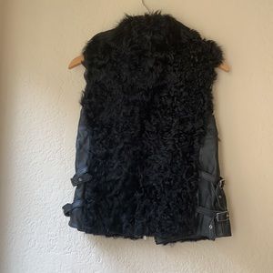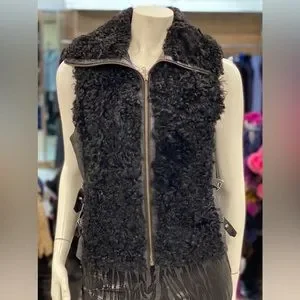 This lamb and leather vest is so chic! Belts are placed on the sides to accentuate your curves. The zipper stops at the ends of the collar giving it a cutting-edge look and feel.