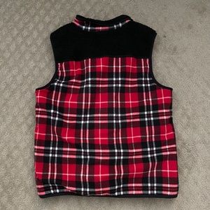 Red, navy, and white plaid, soft, fleece on inside, lightly worn