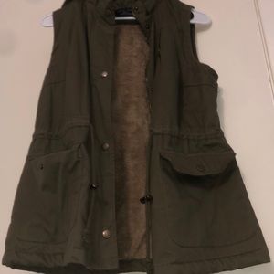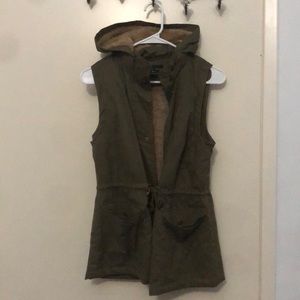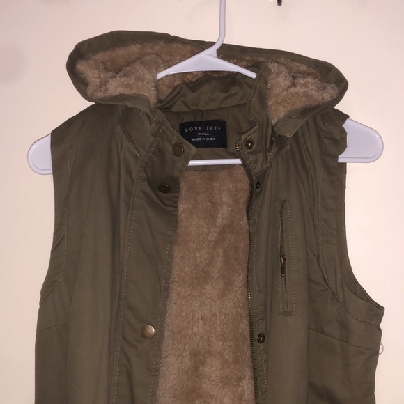 Super cute warm furry vest with hood. Includes zipper and buttons, as well as string to tie in front. Two pockets on sides, and small zipper pocket on top right. Hood is adjustable with zipper; can be taken off. Perfect condition!