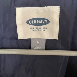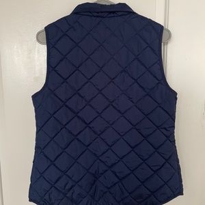 Navy blue puff vest with pockets and gold zipper