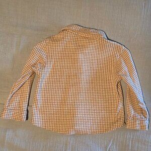 -button up shirt is beige and white checkered pattern. Its super soft, made from 50% cotton and 50% Acrylic. It has sewn on brown buttons and a front pocket on the left chest.
