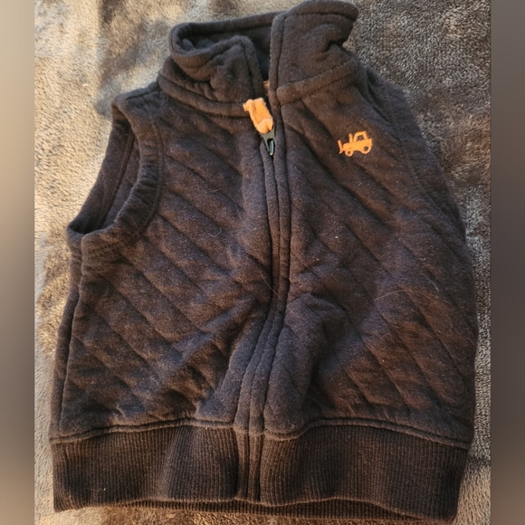 navy blue vest with tan tractor by left shoulder, great for fall