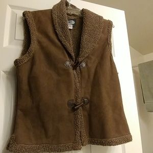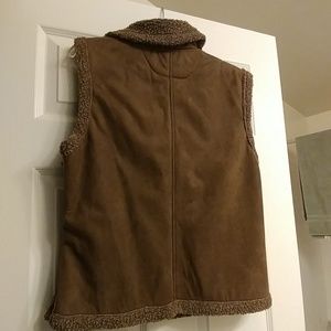 Brown faux suede and sherpa-lined vest jacket with sheep's on collar and around arm holes