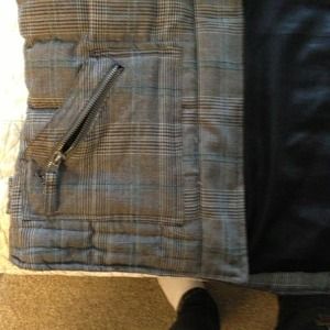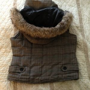 Plad multi color vest ( brownish black with light and medium blue highlighting) fur hood