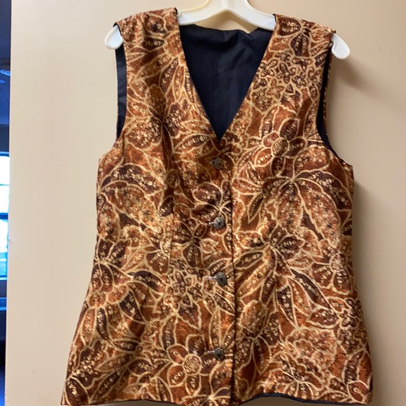 Vest made from vintage fabric, rust/orange print, satiny finish, wonderful jeweled buttons, measures 18” arm pit to arm pit front and back (36” overall), about 26” top to bottom