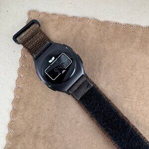 With new batteries. 10 inch Brown Canvas Strap with Velcro Closer, case stainless steel back digital Alarm, up to 100 Meters Water resistant