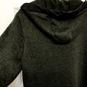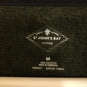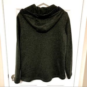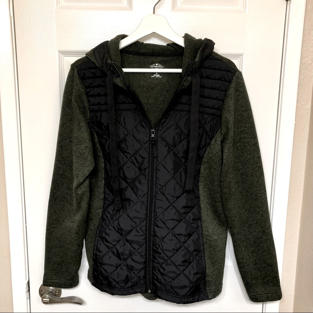 Forrest green zippered jacket with hood, pockets, and black vested front. St Johns Bay size M. Very lightly worn. Machine washable.