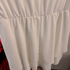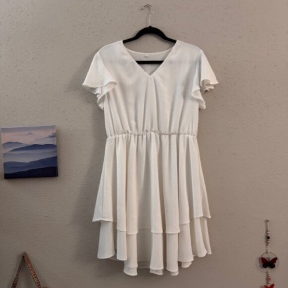 Elegant white dress with a soft V-neckline, short sleeves, and a tiered skirt that adds beautiful movement and a feminine silhouette.