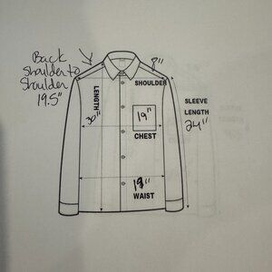 see picture for approximate measurements: Pit to Pit (chest) 19", Shoulder 8", Back (shoulder to shoulder) 19.5", Waist 19", Sleeve 24" from shoulder seam, Length 30"