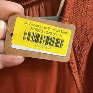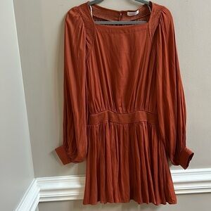 Vestique NWT 20 Seconds or 20 Years Long Sleeve Dress. Beautiful burnt orange color. Lightweight, silky feel(100% polyester). Wide elastic waist. Sleeves have 2 button wrist closure and are voluminous. 3 button closure on back. Size Small