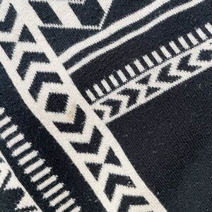Vestique Azteca Print Black & Tan Long Sleeve Drapped Open Cardigan. Open front. Draped in the front. Long sleeves.