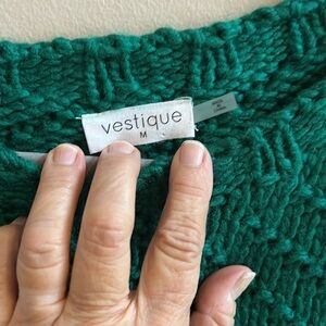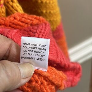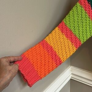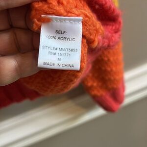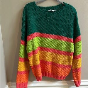 Vestique Multi Stripe Relaxed Fit Sweater. 100% acrylic. Crew neck. Forest green, lime green, orange, gold, coral/melon. Size Medium