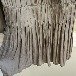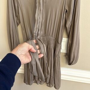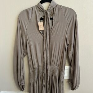 Vestique Dear Diary Long Sleeve Dress NWT. Brownish/olive color. High neck with pleating at front. Long tie at back neck with opening at top. Wide elastic waist with ruching at back. Skirt is lined. Size small