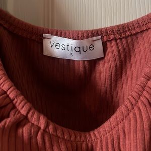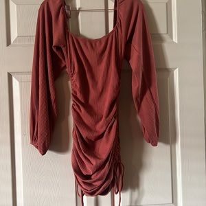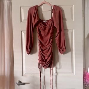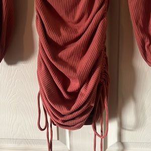 Vestique Ribbed Rust Mini Dress. Ruched sides with adjustable ties. Balloon sleeves. Super stretchy. Unlined. Smoke free home!