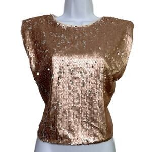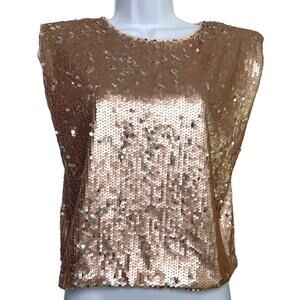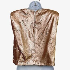 New with tags Vestique Sequin Rose Gold Make a Toast Top in size Large. Details include: round neck, structured shoulder, dropped arm holes, back zipper. Measurements when flat: