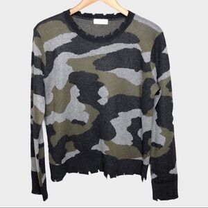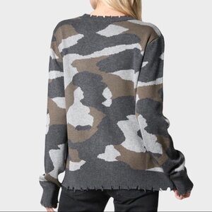 Features: long sleeves, Crewneck, ribbed knit neckline, cuffs and hems, Camo print, relaxed fit, intentional distressed neckline, cuffs and hem, chic, edgy, trendy