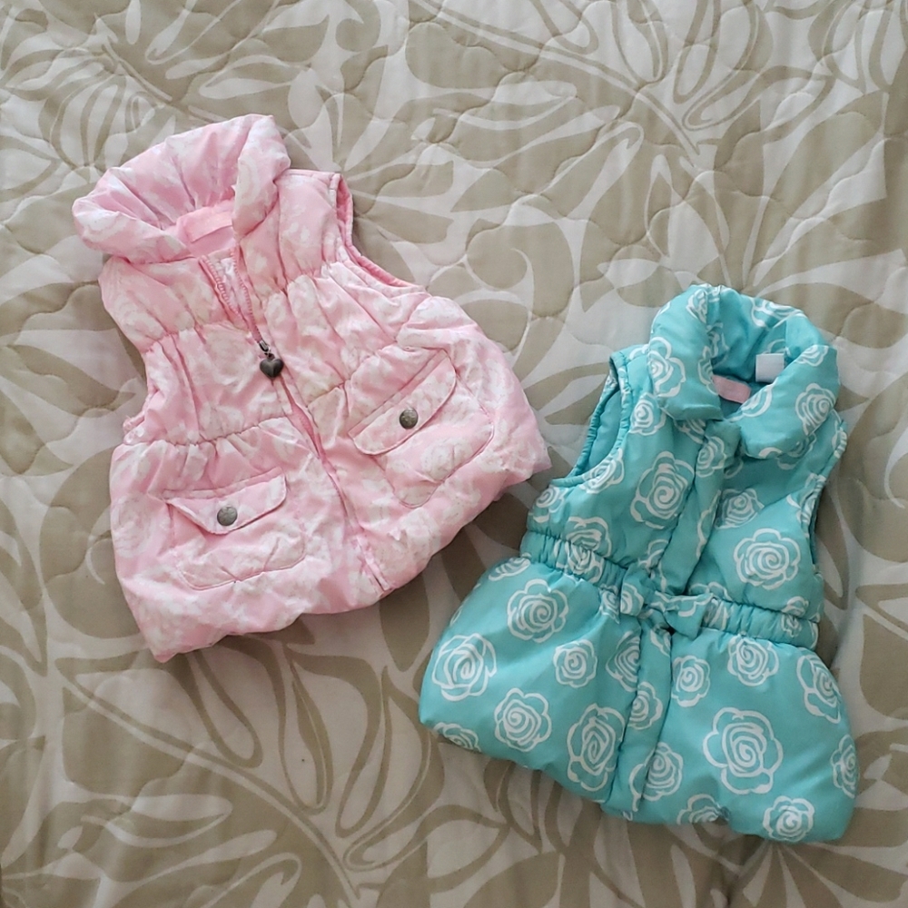 2 kids headquarters vests. Pink with rose print has a heart zipper and 2 button pockets in front size 24M. Turquoise one has cute bow and buttons to close with ties print size 18M. Very gently used by my daughter maybe a handful of times. Smoke and pet free home!