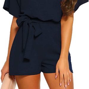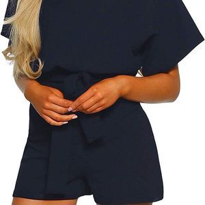 Vetinee Womens Summer Belted Romper Keyhole Back Short Sleeve Jumpsuit