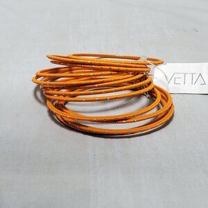 This Vetta set includes 12 individual bangle bracelets, each in a vibrant orange color with small, reflective embellishments. They are designed to be stacked together for a bold, colorful look or worn individually for a more subtle accent.