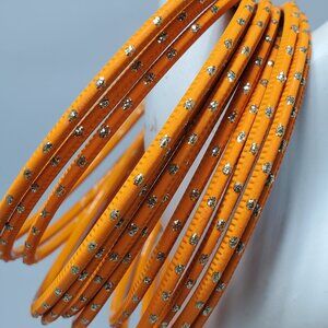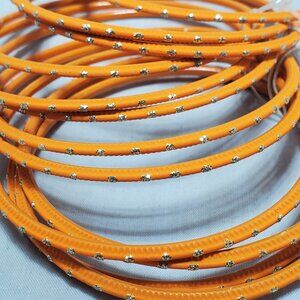 Design: Each bangle is slender and appears to be made of a smooth, possibly enameled or coated material in a bright orange hue. They are adorned with small, silver-toned or iridescent flecks or dots, which provide a subtle sparkle or shimmer.