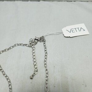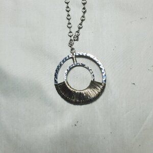 Vetta silver circle wire wrap chain necklace. This 30-inch long necklace, featuring an adjustable extender, showcases a striking 2.5-inch circle pendant. Wrapped in delicate wire, the pendant offers both a length and diameter of 2.5 inches, creating a bold yet sophisticated statement piece. Whether paired with casual or formal attire, this necklace adds a contemporary touch to any look.