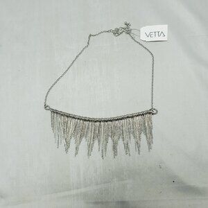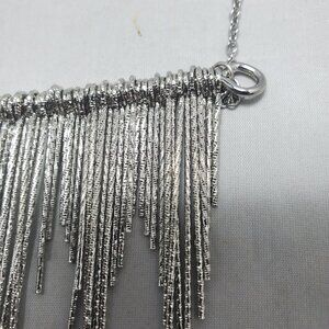 Vetta Sparkling Silver Icicles Bib Necklace, a captivating piece that embodies the elegance of winter. This necklace features a series of independently attached silver icicles, each varying in length from 1 to 2 inches, creating a dynamic, eye-catching design. These shimmering icicles dangle gracefully from a sleek, 6-inch-wide bar, adding a touch of sophisticated sparkle to any outfit. With a total length of 15 inches and an additional 3-inch extender, this versatile necklace fits perfectly with any neckline. Whether for a special occasion or to add a dazzling accent to your everyday style, the Vetta necklace is sure to leave a lasting impression.
