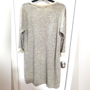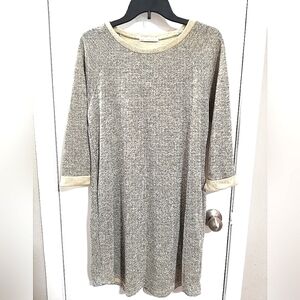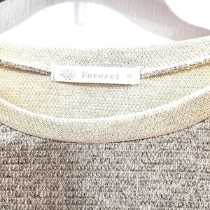 Beautiful Veveret Sweater Dress in tan with silver sparkles woven throughout, in some places the silver sparkles have lifted up above the weave but it's not noticeable, a nice dress to pair with leggings in cooler weather, size small.