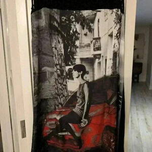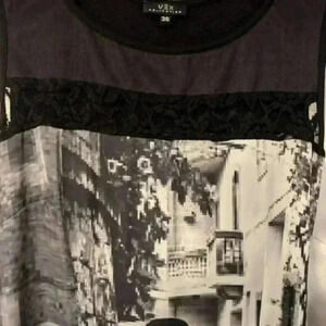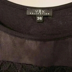 size 36/black red/front feels silky/back has stretch. beautiful dress/sleeveless