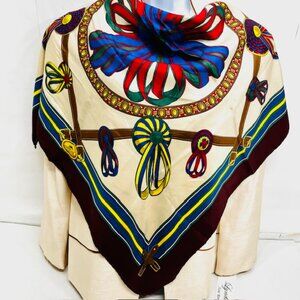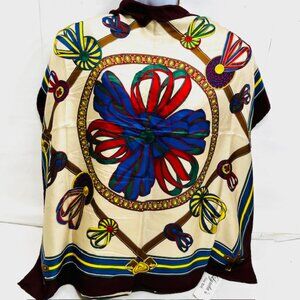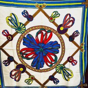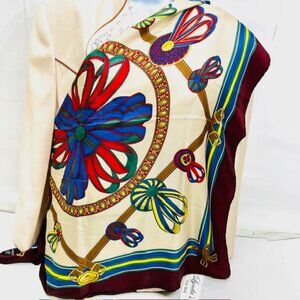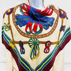 #2) Vintage Longchamp Paris 100% Silk satin scarf, made in Italy, color navy blue burgendy yellow red ivery bow ribbin, logo acent.