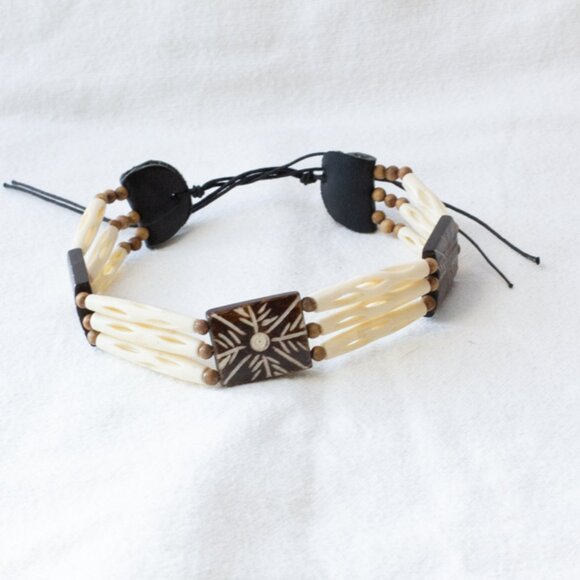 This item is a bone and wood bead choker necklace, often referred to as a "hairpipe choker" or "tribal bone choker". These necklaces typically feature elongated bone beads, smaller round wood spacer beads, and a central carved pendant or centerpiece, held together by a cord with an adjustable tie closure.