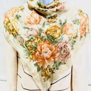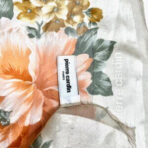 #42) Vintage Pierre Cardin 100% Silk Scarf is a luxurious and stylish accessory for women. Made from high-quality silk chiffon and satin, this 34" square scarf floral orange beige brown green features .