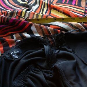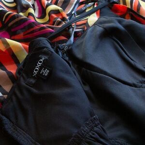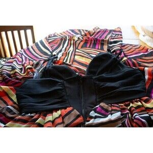 Note this dress is marked 0/0, but it definitely sizes small. The under arm has a V shaped elastic fitted area for extra breast room, so if you are lucky enough to sport a large cup, then this dress is for you. It also has a very 70s vibe with a padded Bra and a metal ring strap, a sexy v-neck, and a typical 2000s high low design. The colors are very vibrant and very 70s indeed.
