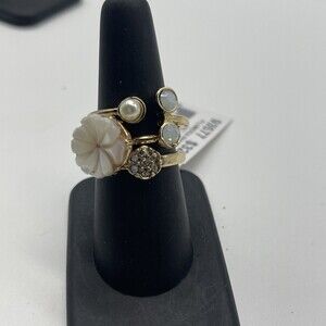 2-Three set rings that come together. All gold tone and one with a small flower embedded with clear stones, second is a open style with milky stones and a faux pearl and third is a carved mother of pearl flower. Called Plumeria ring. Retails for $32