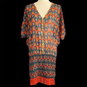 ViX Paula Hermanny Sofia Tajik Coverup Small Fringe Boho Caftan Block Print Swim