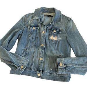 Features: Via Penny Lane Reworked Apparel | Journey Custom Distressed Denim Jacket; One of a kind nostalgic pieces with a modern twist. White House Black Market distressed jean jacket, Journey 30th Anniversary graphic sewn onto the back.