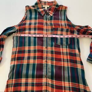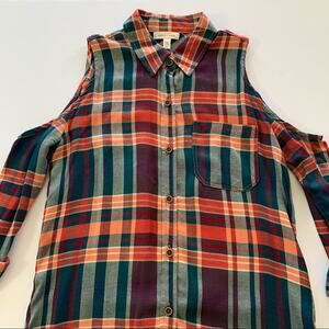Features: Via Penny Lane Reworked Apparel | Margaritaville Graphic Button Up Flannel Shirt; One of a kind nostalgic pieces with a modern twist. Silence + Noise green, orange and purple cold shoulders plaid flannel shirt, Margaritaville “Drinks Well With Others” graphic sewn onto the back.