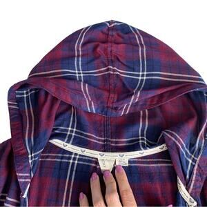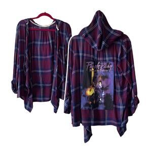 Features: Via Penny Lane Reworked Apparel | Prince Custom Purple Plaid Cardigan; One of a kind nostalgic pieces with a modern twist. Roxy purple plaid, open front flannel hooded cardigan, Prince “Purple Rain” graphic sewn onto the back.