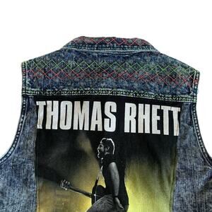 Features: Via Penny Lane Reworked Apparel | Thomas Rhett Custom Upcycled Denim Vest; One of a kind nostalgic pieces with a modern twist. Diamonds & Threads jean vest with neon threads, Thomas Rhett graphic sewn onto the back.