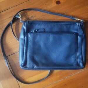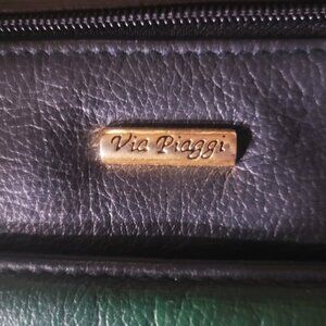 Via Piaggi crossbody purse made of black leather, with multiple zippered compartments, a front pocket, and a long adjustable strap. Via Piaggi is known for producing high-end fashion accessories.