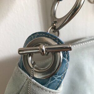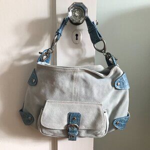 Adorable light blue suede shoulder bag. Animal print embossed leather shoulder strap and buckle closures. Silver hardware. Magnetic snap closure. Interior tan fabric lining. Bag has never been used, but suede is visibly dusty from storage.
