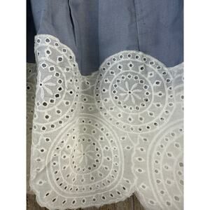 -Size 10 silk 100% a line pleated, eyelet, scalloped trim, pockets, zipper closure no lining pale blue and white, easter.