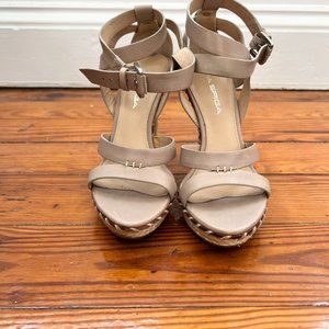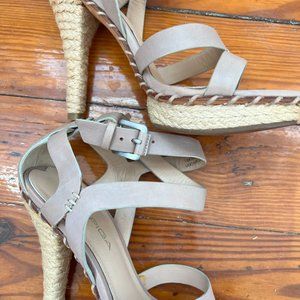 These beige sandals feature genuine leather, a jute wrapped platform heeled espadrille bottom, and adjustable buckle ankle straps.